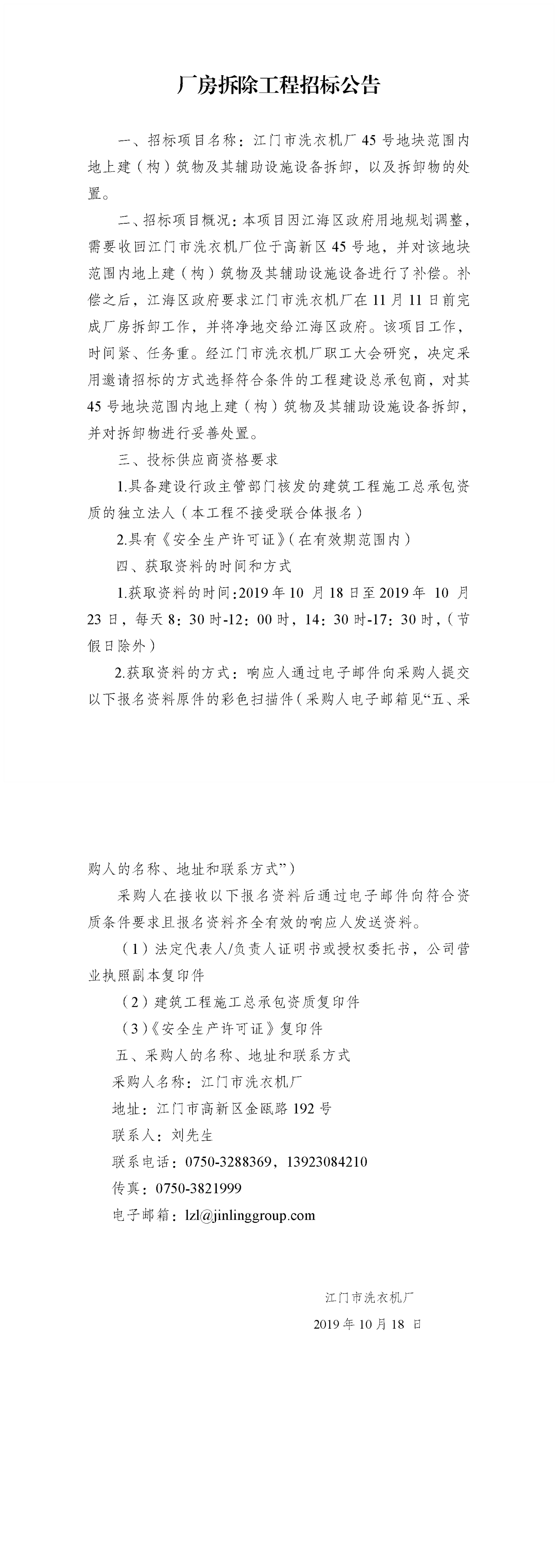 江門市洗衣機廠45號地塊范圍內地上建(構)筑物及其輔助設施設備拆卸以及拆卸物處置項目采購公示